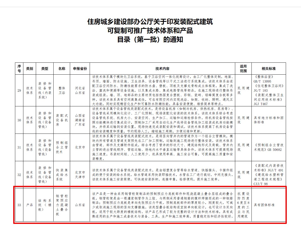 日前,住房和城鄉(xiāng)建設(shè)部通過(guò)官方網(wǎng)站,正式發(fā)布了《裝配式建筑可復(fù)制可推廣技術(shù)體系和產(chǎn)品目錄(第一批)》。其中,產(chǎn)發(fā)集團(tuán)投資企業(yè)山東萬(wàn)斯達(dá)科技股份有限公司(以下簡(jiǎn)稱(chēng)“萬(wàn)斯達(dá)科技”),憑借自主研發(fā)的“鋼管桁架預(yù)應(yīng)力混凝土疊合板”技術(shù)成功入選,并獲市住房城鄉(xiāng)建設(shè)局舉行推介會(huì)專(zhuān)題推介。